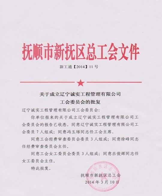 熱烈祝賀遼寧誠(chéng)實(shí)工程管理有限公司工會(huì)委員會(huì)正式成立!