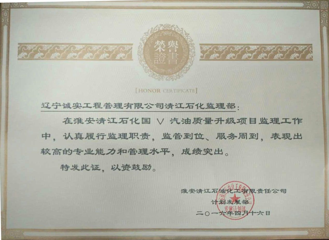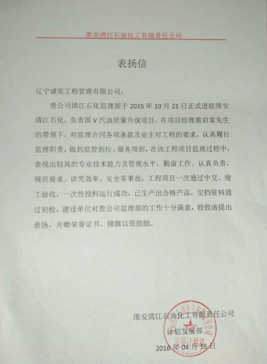 我公司監(jiān)理人員在“中石化淮安清江石油化工有限責(zé)任公司國Ⅴ汽油質(zhì)量升級項(xiàng)目”工程監(jiān)理服務(wù)工作中,得到了建設(shè)單位的一致認(rèn)可和肯定,對我們的工作表示十分滿意,特發(fā)函提出表揚(yáng),并贈與榮譽(yù)證書、錦旗以資鼓勵(lì)。
