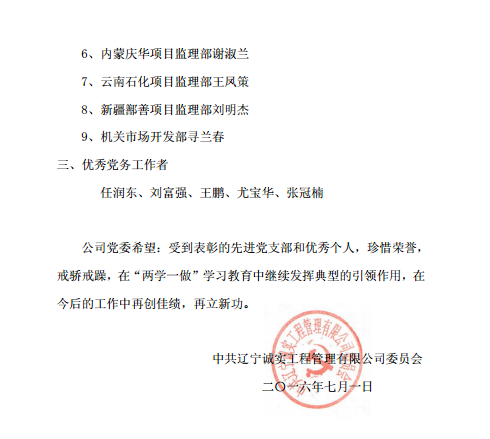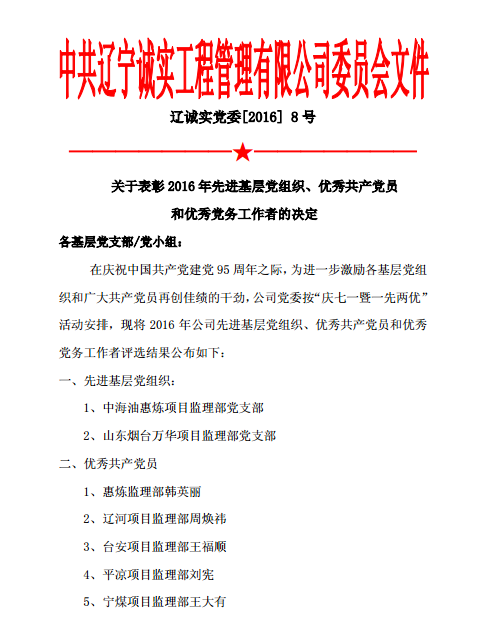 7月1日下午,公司黨委召開(kāi)《慶祝建黨95周年暨“一優(yōu)兩先”表彰視頻大會(huì)》。主會(huì)場(chǎng)設(shè)在公司一樓會(huì)議室,中海油惠州項(xiàng)目監(jiān)理部黨支部、甘肅華亭項(xiàng)目監(jiān)理部黨支部、神華寧煤項(xiàng)目監(jiān)理部黨支部、煙臺(tái)萬(wàn)華項(xiàng)目監(jiān)理部黨支部設(shè)立視頻分會(huì)場(chǎng)。黨委副書(shū)記馮玉琢主持了視頻大會(huì)。首先為新黨員中海油惠州項(xiàng)目監(jiān)理部黨支部的李婷婷舉行了入黨宣誓儀式,公司黨委委員劉興善同志宣讀了公司黨委對(duì)戰(zhàn)勝、吳琪轉(zhuǎn)為中共正式黨員的批復(fù)。公司黨委委員馬俊同志宣讀了“一優(yōu)兩先”表彰決定。黨委書(shū)記孫學(xué)良結(jié)合公司實(shí)際做了慶祝建黨95周年的講話(huà)。最后全體黨員重溫的入黨誓詞,進(jìn)行入黨宣誓。