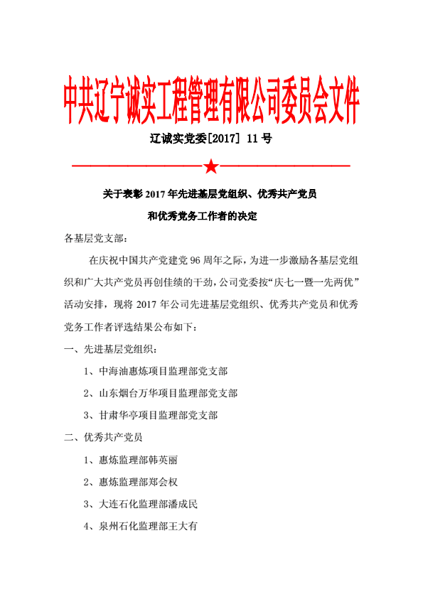 為慶祝中國共產(chǎn)黨建黨96周年,公司黨委于2017年6月30日下午在公司一樓會議室召開了慶祝建黨96周年暨“一優(yōu)兩先”表彰視頻大會。公司機關(guān)、撫順各項目監(jiān)理部及在撫的黨員同志在主會場參加了大會,中海油惠州項目監(jiān)理部黨支部、甘肅華亭項目監(jiān)理部黨支部、寧夏石化項目監(jiān)理部黨支部、中化泉州項目監(jiān)理部黨支部、廣西石化項目監(jiān)理部黨支部、蘭州石化項目監(jiān)理部黨支部、內(nèi)蒙古君正項目監(jiān)理部黨支部、神華寧煤項目監(jiān)理部黨支部、煙臺萬華項目監(jiān)理部黨支部設(shè)立視頻分會場。黨委委員馬駿主持了視頻大會。首先,公司黨委副書記馮玉琢同志宣讀了“一優(yōu)兩先”表彰決定。接著,黨委書記孫學(xué)良結(jié)合公司實際做了慶祝建黨96周年的講話。最后全體黨員重溫的入黨誓詞,進行入黨宣誓。